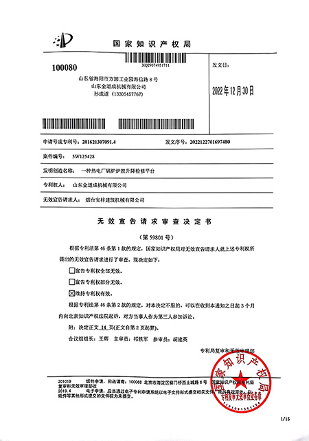 煙臺(tái)寶梓建筑機(jī)械有限公司抄襲的專(zhuān)利(專(zhuān)利號(hào):201820409444.4),于2021年02月01日被國(guó)家知識(shí)產(chǎn)權(quán)局專(zhuān)利復(fù)審委員會(huì)宣告專(zhuān)利權(quán)全部無(wú)效。該公司惡意提起無(wú)效山東金道成機(jī)械有限公司有關(guān)專(zhuān)利的申請(qǐng),經(jīng)過(guò)國(guó)家知識(shí)產(chǎn)權(quán)局專(zhuān)利復(fù)審委員會(huì)的有關(guān)審查程序,根據(jù)《專(zhuān)利法》第46條第1款的規(guī)定,于2022年12月30日對(duì)我公司兩項(xiàng)專(zhuān)利做出宣告專(zhuān)利權(quán)全部有效的審查決定。