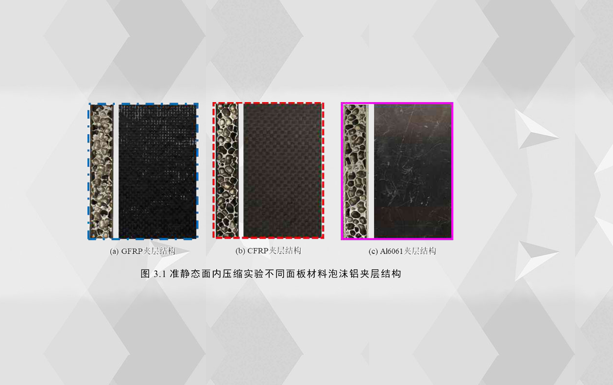 泡沫鋁夾層結(jié)構(gòu)在汽車應(yīng)用中所承載的另一種典型工況為面內(nèi)壓縮,例如泡沫鋁填充引擎蓋、側(cè)門等,例如泡沫鋁填充的前縱梁,當(dāng)汽車發(fā)生正面碰撞交通事故時,當(dāng)沖擊速度較大時,引擎蓋、側(cè)門會發(fā)生較大的擠壓面內(nèi)變形,而夾層結(jié)構(gòu)在面內(nèi)壓縮工況下的失效機理和吸能特性也是相當(dāng)復(fù)雜的,為了推動夾層結(jié)構(gòu)在汽車上的應(yīng)用,對泡沫鋁夾層結(jié)構(gòu)在面內(nèi)壓縮工況下全面系統(tǒng)的研究是很有必要的。本章主要通過實驗的方法,揭示了不同配置的泡沫鋁夾層結(jié)構(gòu)在準靜態(tài)面內(nèi)壓縮工況下的結(jié)構(gòu)響應(yīng)機理、失效模式以及耐撞性能,得出何種配置的泡沫鋁夾層結(jié)構(gòu)的耐撞性能更優(yōu),泡沫鋁夾層結(jié)構(gòu)的配置參數(shù)主要包括面板材料、面板厚度、芯層高度和芯層密度。
