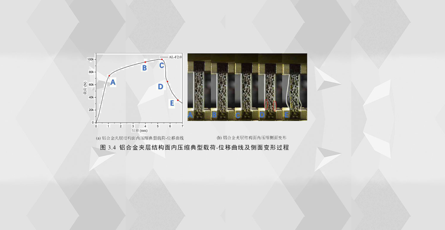 圖3.4(a)描繪了鋁合金夾層結構在面內壓縮下典型載荷-位移曲線,其壓潰過程大體可以分為三個階段,O-A彈性階段,此階段結構處于彈性變形,載荷與位移的關系為線性增長;A-C塑性階段,在此階段結構面板受到較大的壓力而產生塑性變形,載荷與位移仍近似呈線性增長趨勢,只是載荷增長幅度遠小于彈性階段增長幅度;C之后屬于后屈曲階段,由于在此階段面板發生嚴重屈曲變形,并且面板與芯層之間的膠層出現大面積失效,這導致夾層結構的承載能力大大降低,此外,由于泡沫芯層壓縮的效果,在面板失穩之后夾層結構仍有較弱的承載能力,并未完全失去承載能力,圖3.4(b)為此試件在圖3.4(a)各點時刻側面面板與芯層泡沫的變形圖。